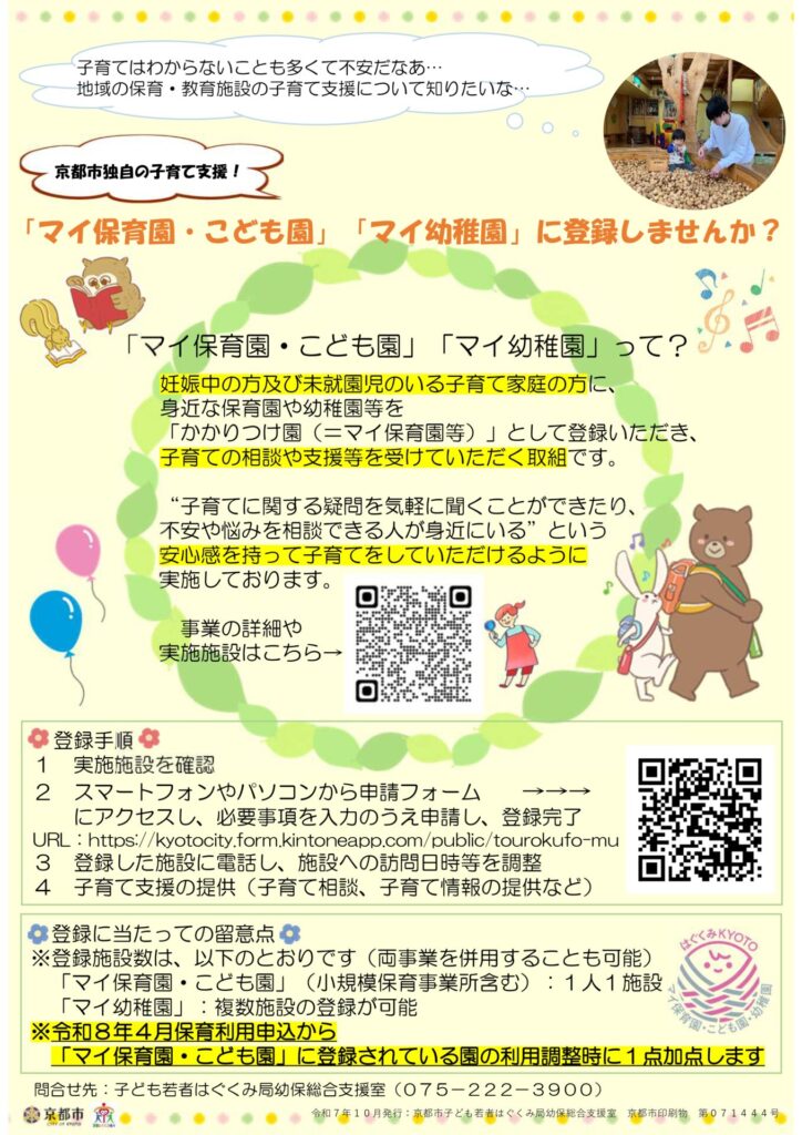 ももやま白菊保育園 #お知らせ #ももやま白菊保育園 #京都市伏見区 #保育園 #園児募集 2025年10月17日 京都市子育て支援子育て中の方、保育園・こども園への入園を検討されている方お問い合わせは案内に記載の連絡先はおねがいします 一覧へ戻る